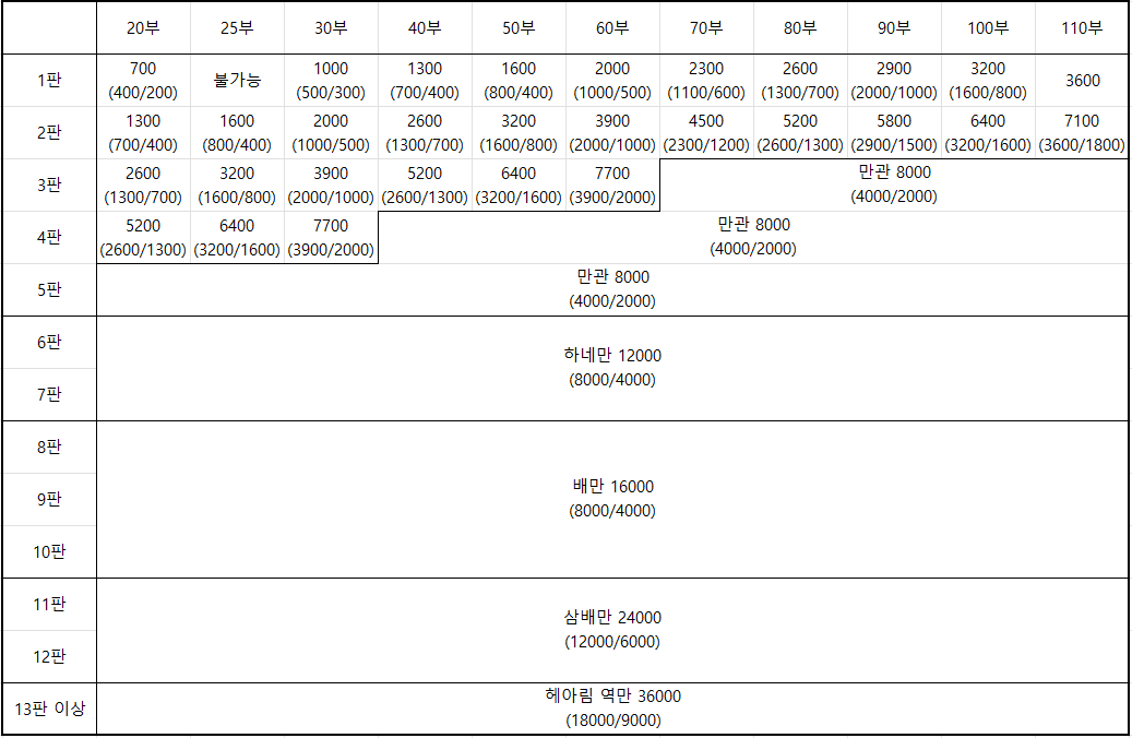 또한 판수계산법 자 2판의 2000점(1000/500)은 친이 1000점, 자가 각자 500점씩을 지불함을 의미한다.
