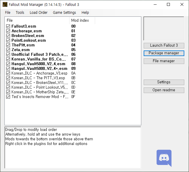 최신 버전을 받아서 실행하고 폴아웃 3의 디렉토리를 제대로 설정하면 DLC와 기존에 설치한 한글패치 등을 포함한 모드들을 전부 인식할 것이다.