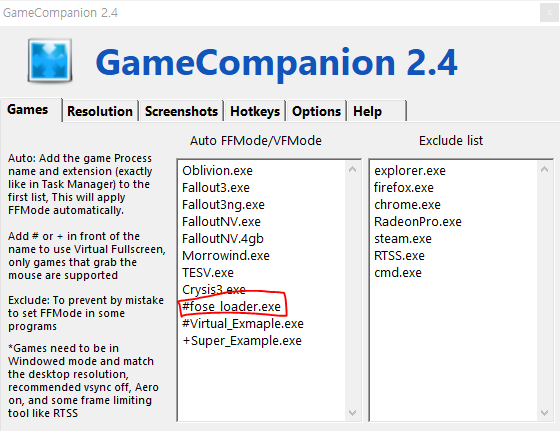 GameCompanion을 켜고 위 사진과 같이 Fake Fullscreen Mode 목록에 fose_loader.exe를 추가한다.